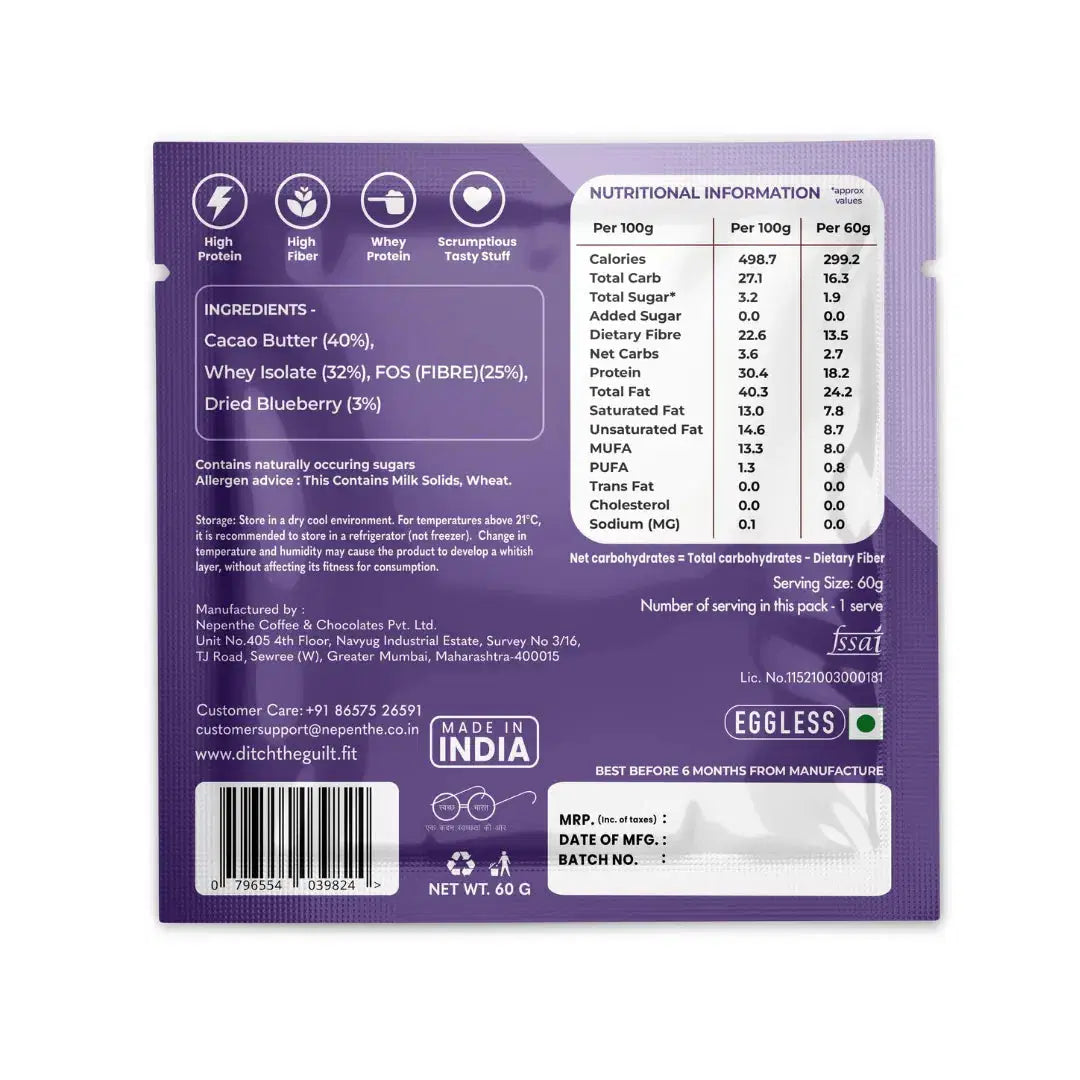 Ingredients: Whey Protein, Cocoa Powder, Cocoa Butter, Erythritol, Dried Blueberries, Coconut Oil, FOS (Fiber), Monk Fruit.