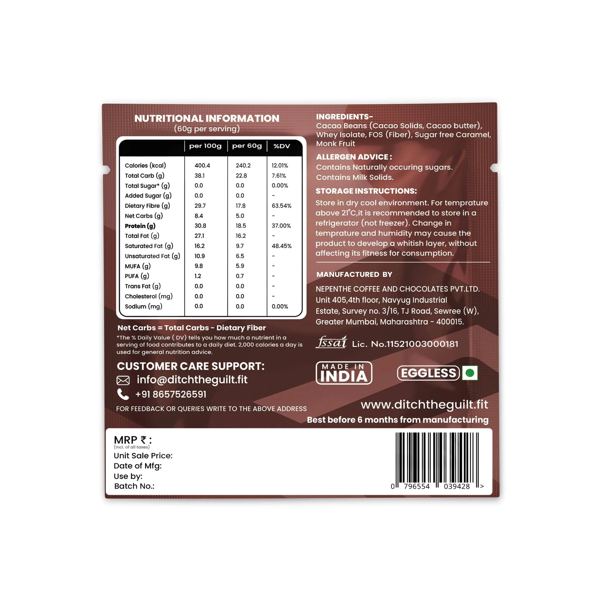 Ingredients: Whey Protein, Cocoa Beans, Cocoa Butter, Erythritol, Coconut Oil, Olive Oil, FOS (Fiber), Monk Fruit.