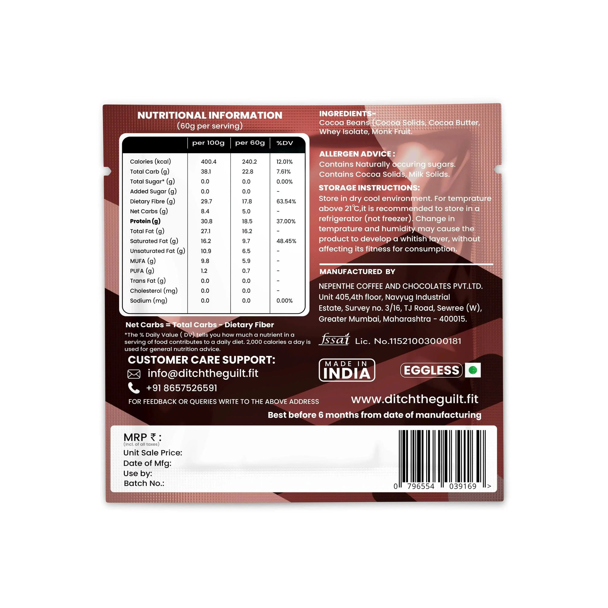 Ingredients: Whey Protein, Cocoa Beans, Cocoa Butter, Erythritol, Coconut Oil, Olive Oil, FOS (Fiber), Sugar-Free Dark Chocolate Chips, Monk Fruit.