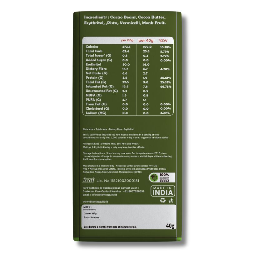 Dubai Pista Kunafa Dark Chocolate • 104 Calories • Sugar Free & Low Cal • 40g
