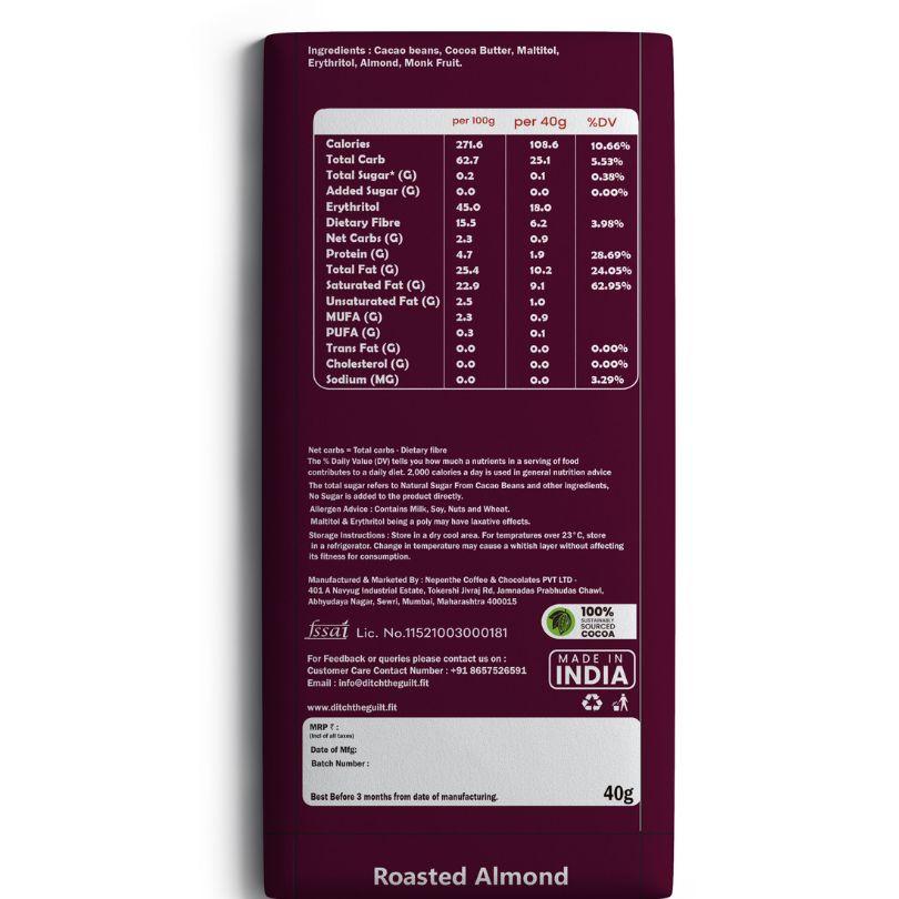 Ingredients: Cocoa Beans, Erythritol, Roasted California Almonds, Monk Fruit.