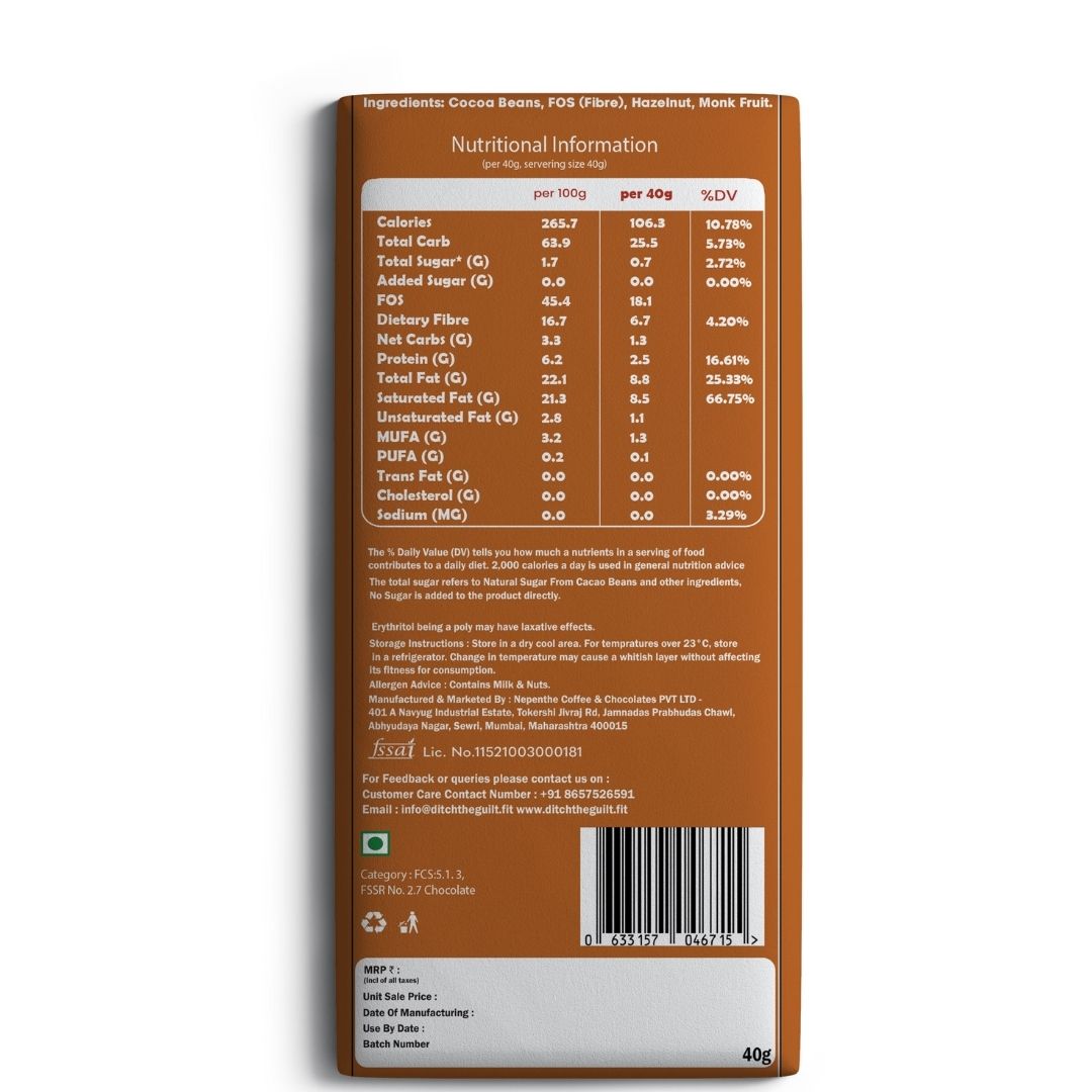 Ingredients: Cocoa Beans, FOS, Roasted Hazelnut, Monk Fruit.