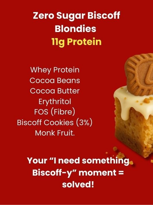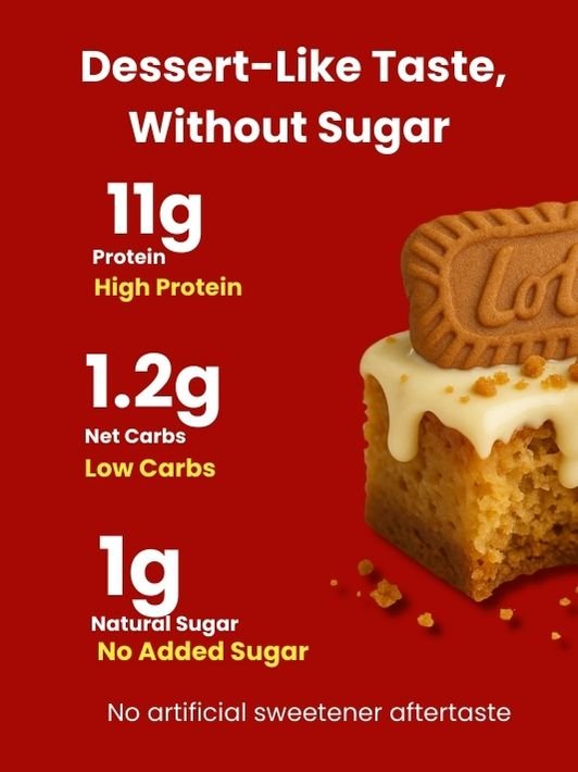 Ingredients: Whey Protein, Cocoa Beans, Cocoa Butter, Erythritol, FOS (Fiber), Biscoff Cookies (3%), Monk Fruit.