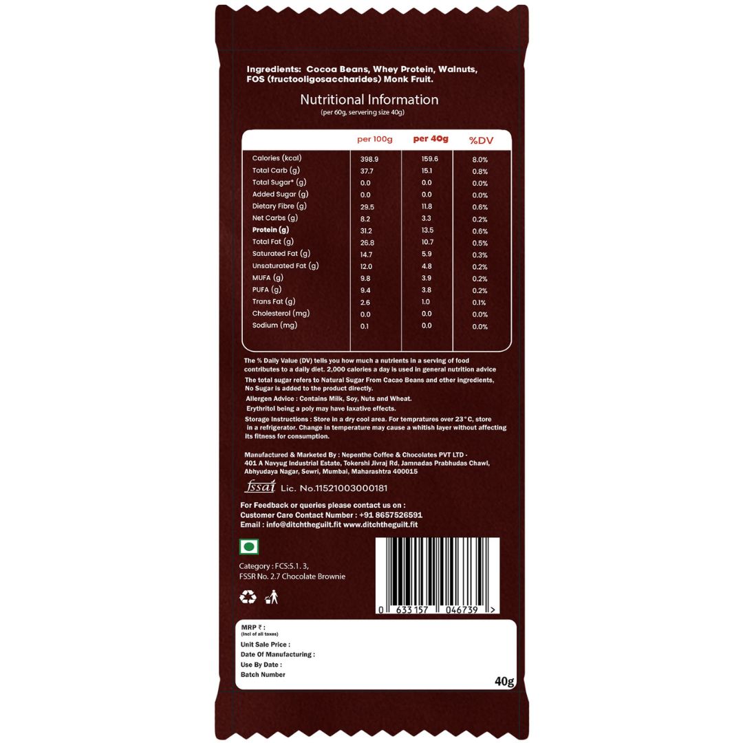 Classic Walnut Protein Brownie • 13g Protein • Sugar Free & High Protein • 40g