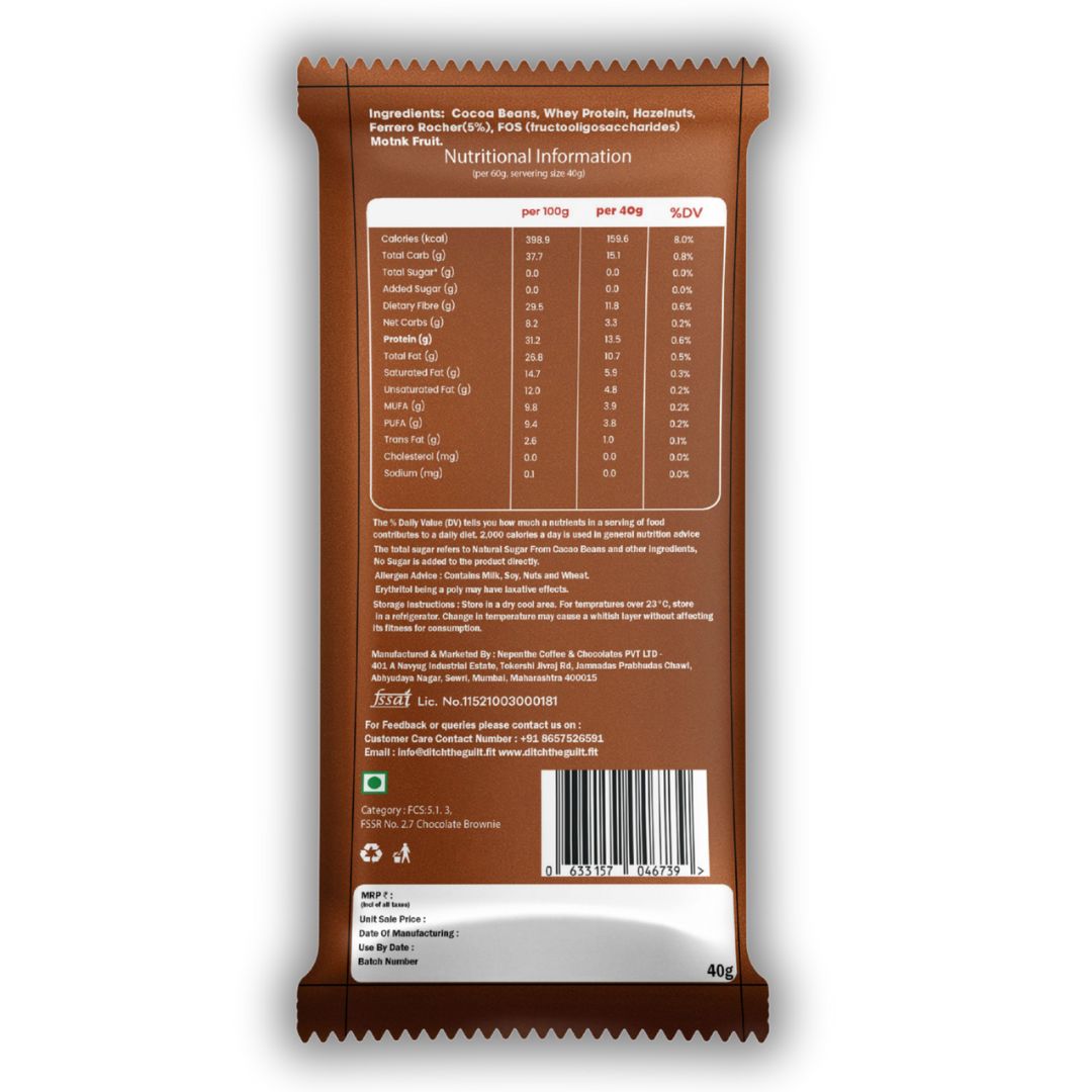 Ingredients: Whey Protein, Cocoa Beans, Cocoa Butter, Erythritol, FOS (Fiber), Hazelnuts, Ferrero Rocher (5%), Monk Fruit.
